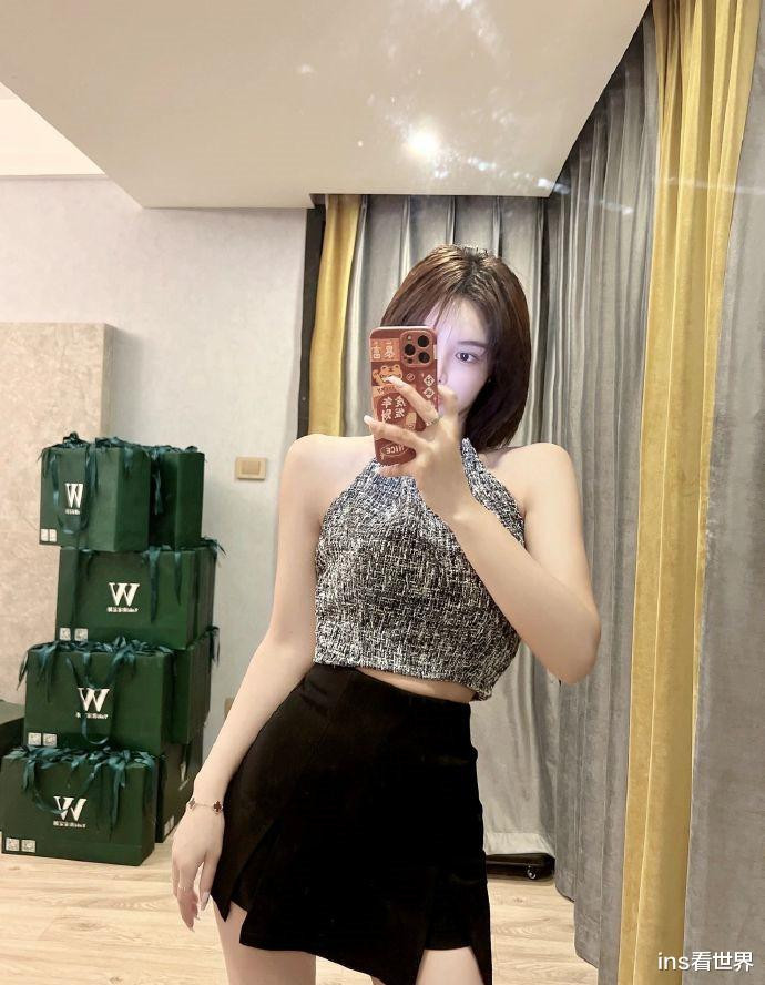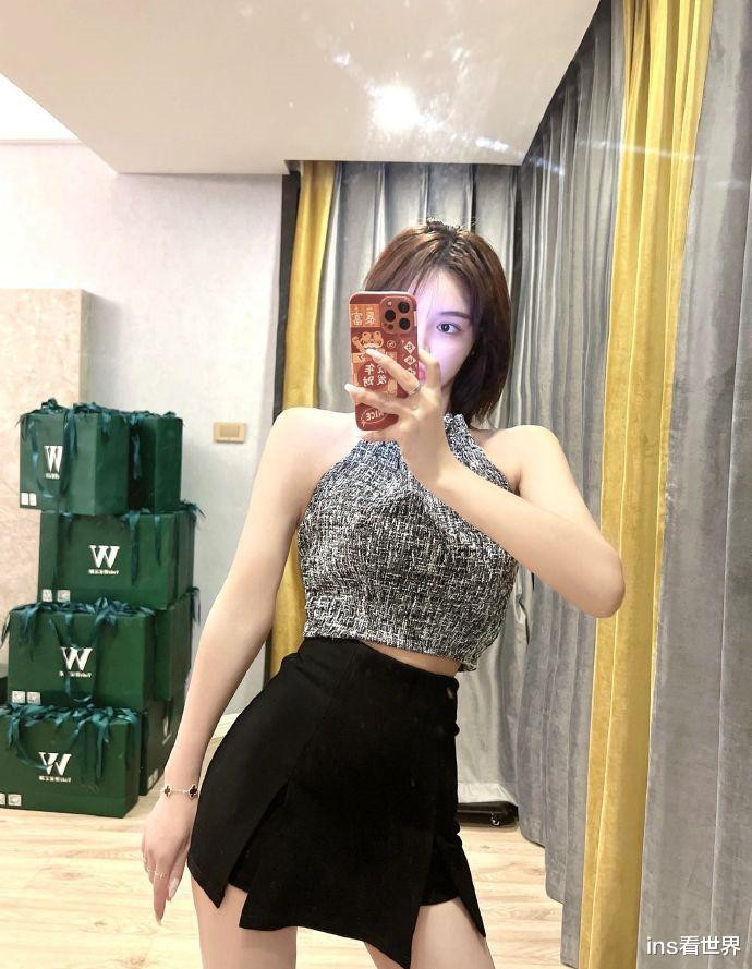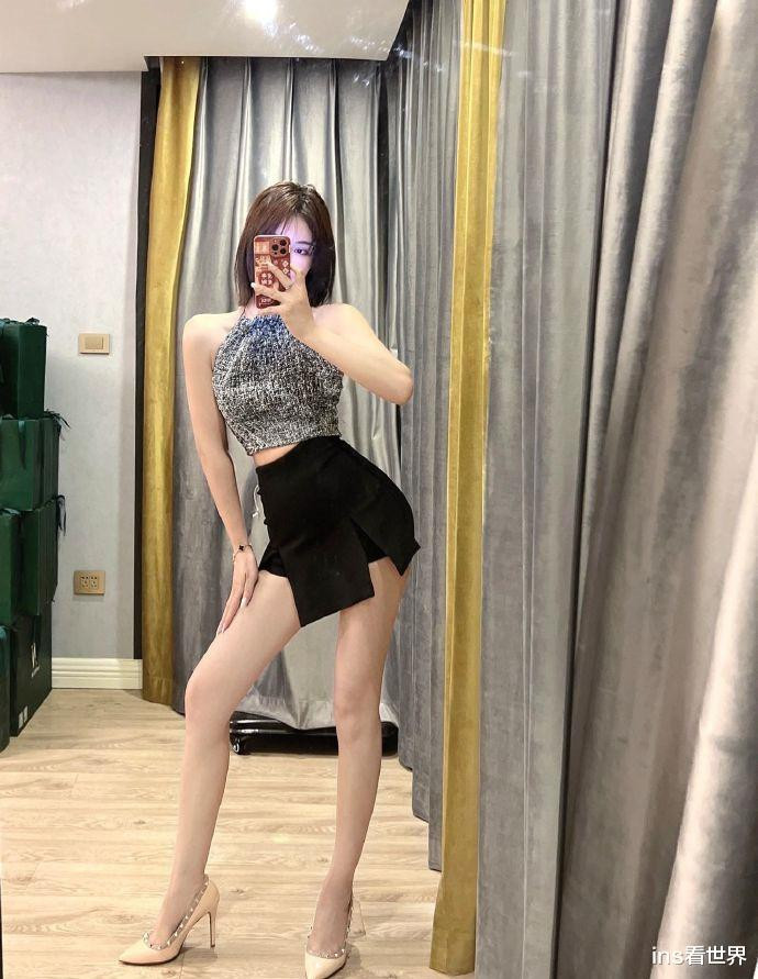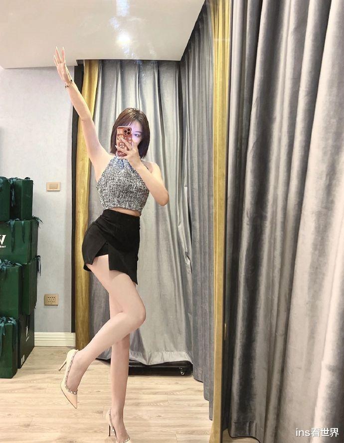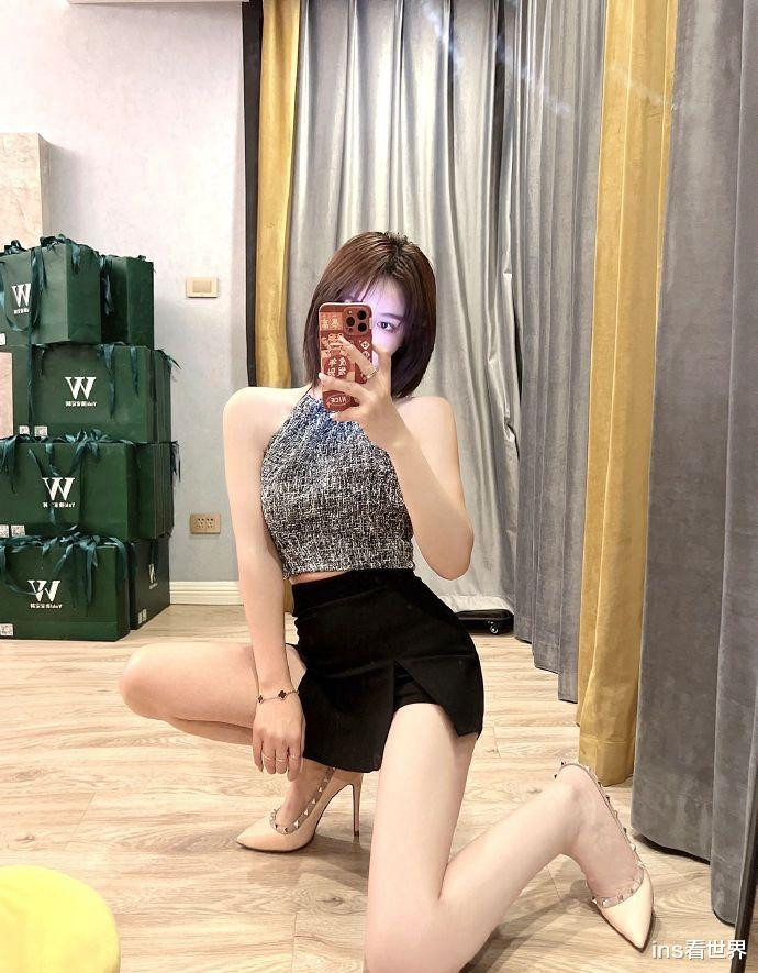 哈喽大家好,我是你们的小编:ins看世界,小姐姐站在落地镜前,手中的手机微微举起,寻找着最佳角度。她身着一件简约的背心,露出纤细的手臂和精致的锁骨线条。下身搭配一条高腰黑色短裙,裙摆恰到好处地停留在大腿上方,展现出修长的双腿。脚上踩着一双白色尖头高跟鞋,为整体造型增添了一抹亮色。